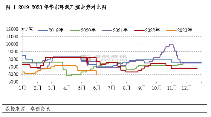 【导语】5月份环氧乙烷价格走势下滑,东北地区先跌,随后华东地区月底下跌。截至目前华东环氧乙烷价格执行6000元/吨,较月初下滑500元/吨,同比跌幅22%;下滑主要压力来自供应过剩,出货被动以及需求改善有限等,加之本月新装置投产以及检修复产等较为集中加重本月供应压力,由此价格下滑接近历史低位。