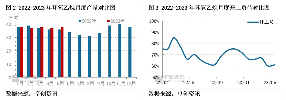5月环氧乙烷供大于求情况加剧,华东供应量增多。5月新一套装置,扩产一套装置,另外检修复产装置陆续恢复,月度产量同比上涨5.5%,使得本月供应压力不减。开工负荷月度平均开工负荷提升1个百分点,主要来自本月新投产装置后,整体产能基数拉大,实际月度开工负荷高于平均负荷。