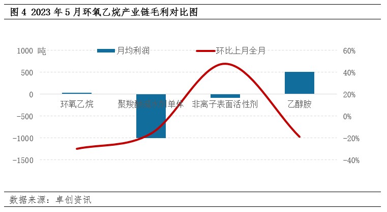 外采乙烯环氧乙烷在成本线边缘徘徊,主力下游均处于亏损状态。外采乙烯5月平均毛利37元/吨,环比-30%,同比-89%。聚羧酸减水剂单体月度毛利-1001元/吨,环比下滑16%。产业链毛利下滑主要压力来自,目前下游价格也处于历史低位,尤其聚羧酸减水剂单体在产能过剩压力下,阶段性价格均超跌于原料,所以处于一个长周期亏损状态。环氧乙烷产业链整体利润表现欠佳,供需矛盾凸显。
