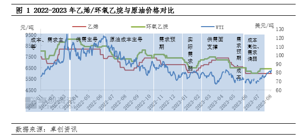8月份环氧乙烷价格主导因素成本,国际原油稳中上行,乙烯高位震荡,成本端承压明显。从下图可以看出,7月开始,因成本面预期增强后,环氧乙烷供应面逐步收紧止损,8开始市场价格逐渐转为成本主导。7月以来原油表现稳中上探,对乙烯和环氧乙烷成本面支撑尚可,