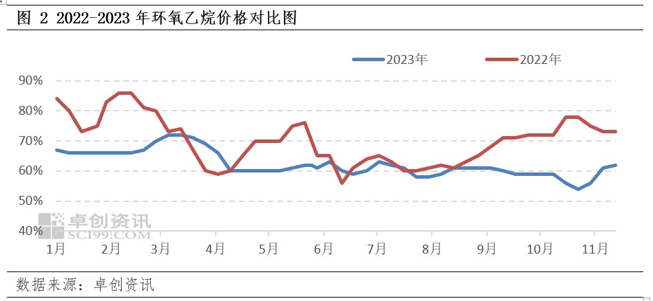 11月第三周,环氧乙烷开工负荷环比提升两个百分点,同比下滑11个百分点。从环氧乙烷同比开工负荷来看,2023年开工负荷下滑明显,主要原因来自利润低以及供应压力大,工厂生产积极性不高。从开工负荷环比数据来看,环比上周提升2个百分点,主要来自四川石化装置恢复,以及部分装置提负荷。据卓创资讯数据统计显示,环氧乙烷周度开工负荷维持62%,整体处于低位负荷运行态势。